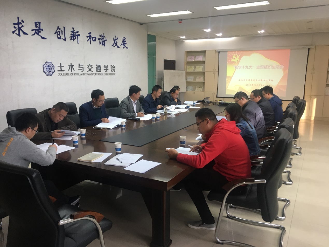 2017年10月25日下午,我院教工三支部在科学馆507会议室召开了“我学十九大”主题组织生活会。会议由支部书记陈育民同志主持,防灾所和隧道所的教师和部分研究生参加了本次组织生活会。