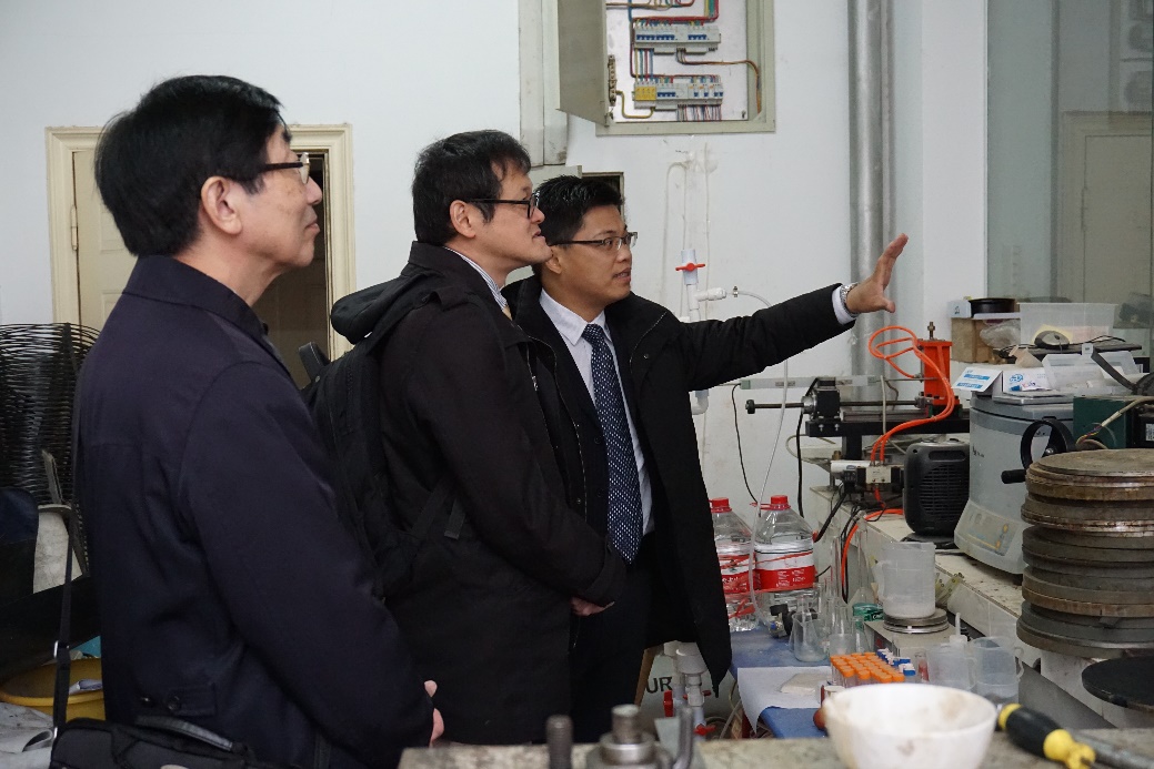 一井康二教授(中)和土田昭司教授(左)参观实验室 |